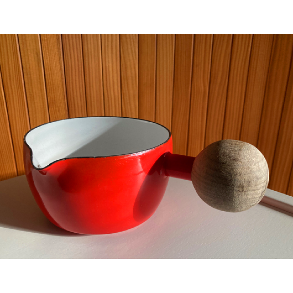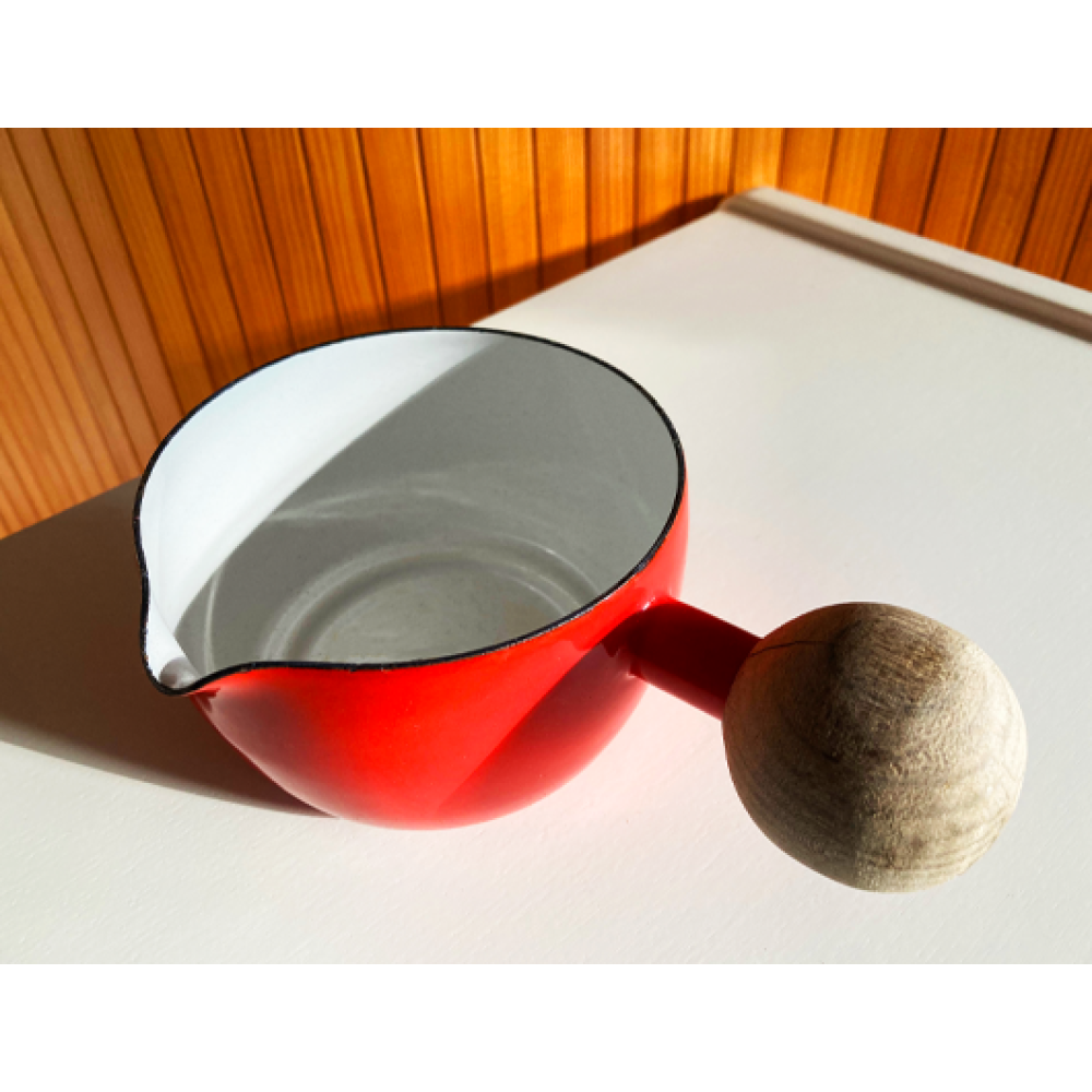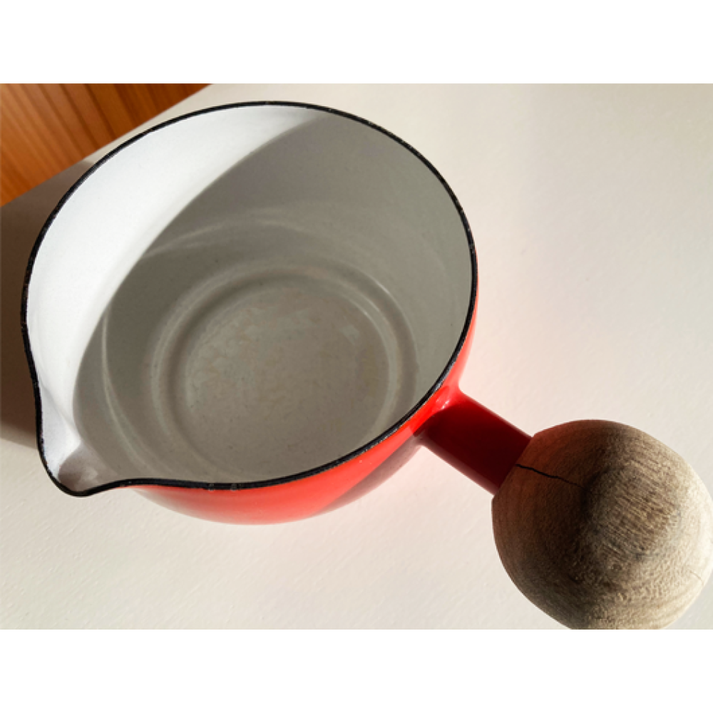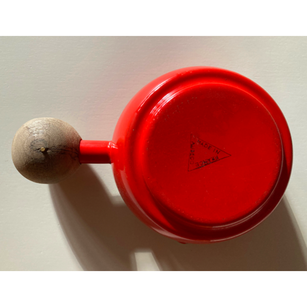Deze kleine rood geëmailleerde sauspan komt uit Frankrijk en is geproduceerd bij Aubecq France.