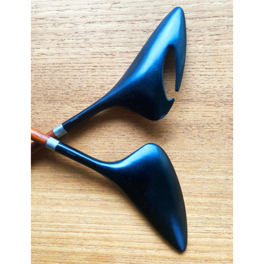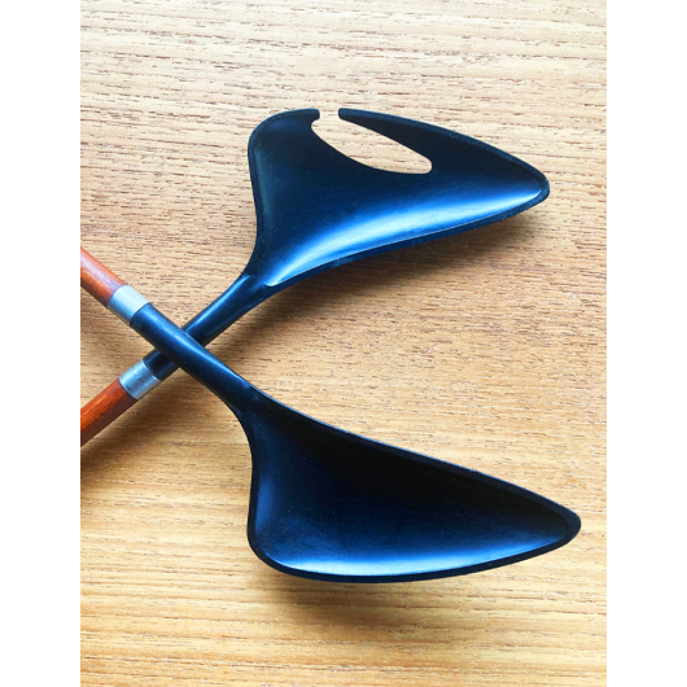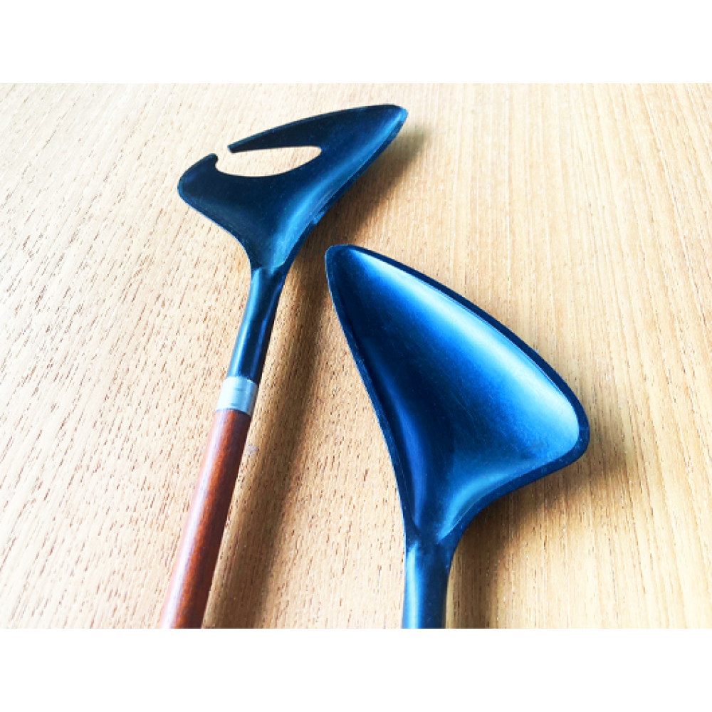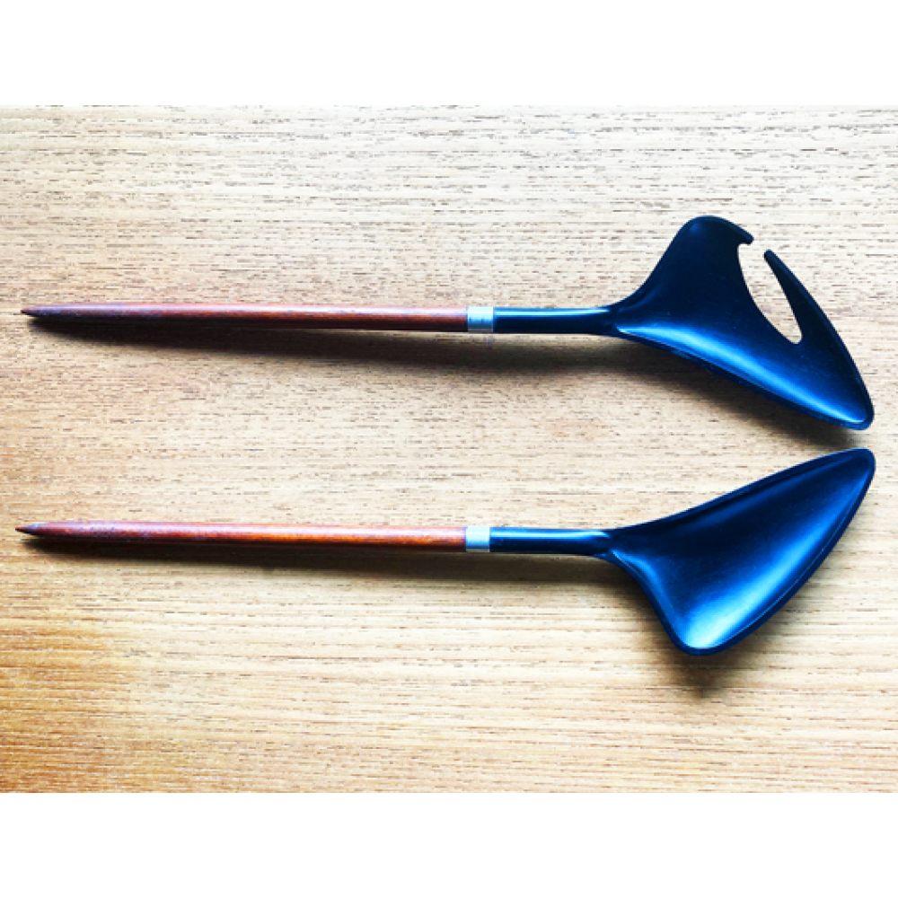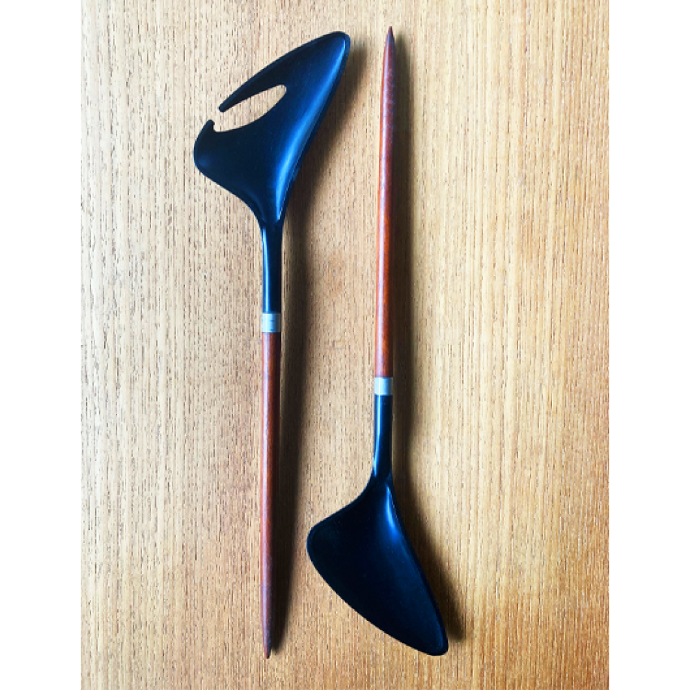 Dit elegant saladebestek van teak en zwart plastic werden begin jaren 60 in Denemarken gemaakt.