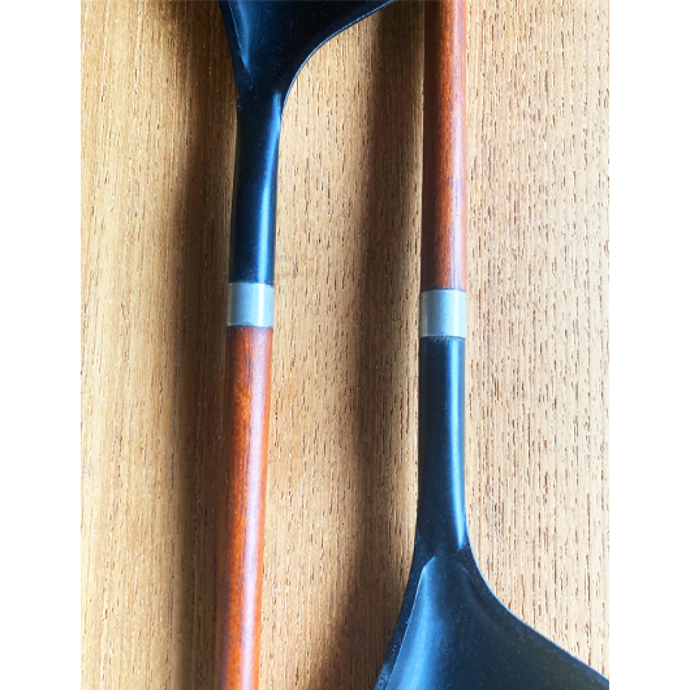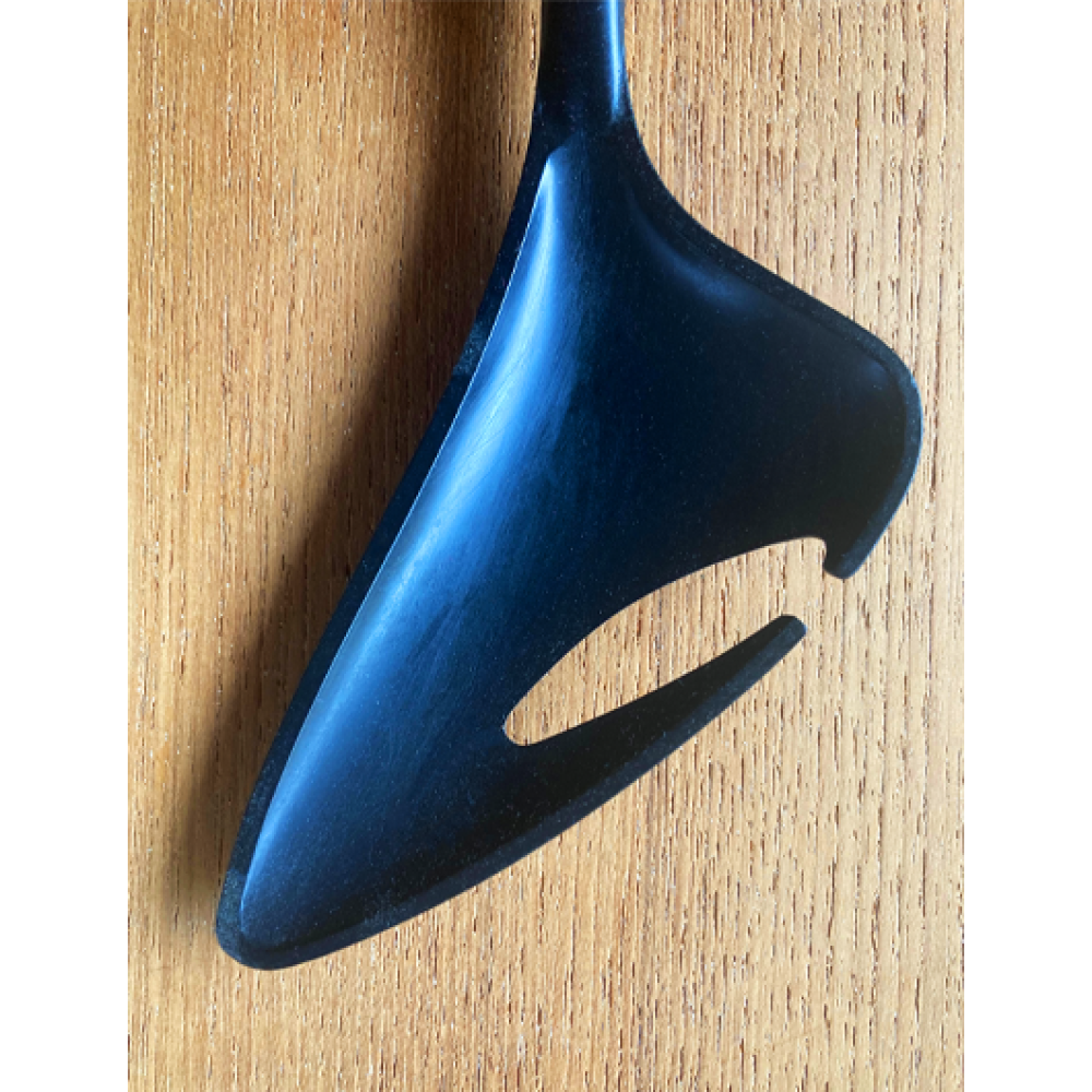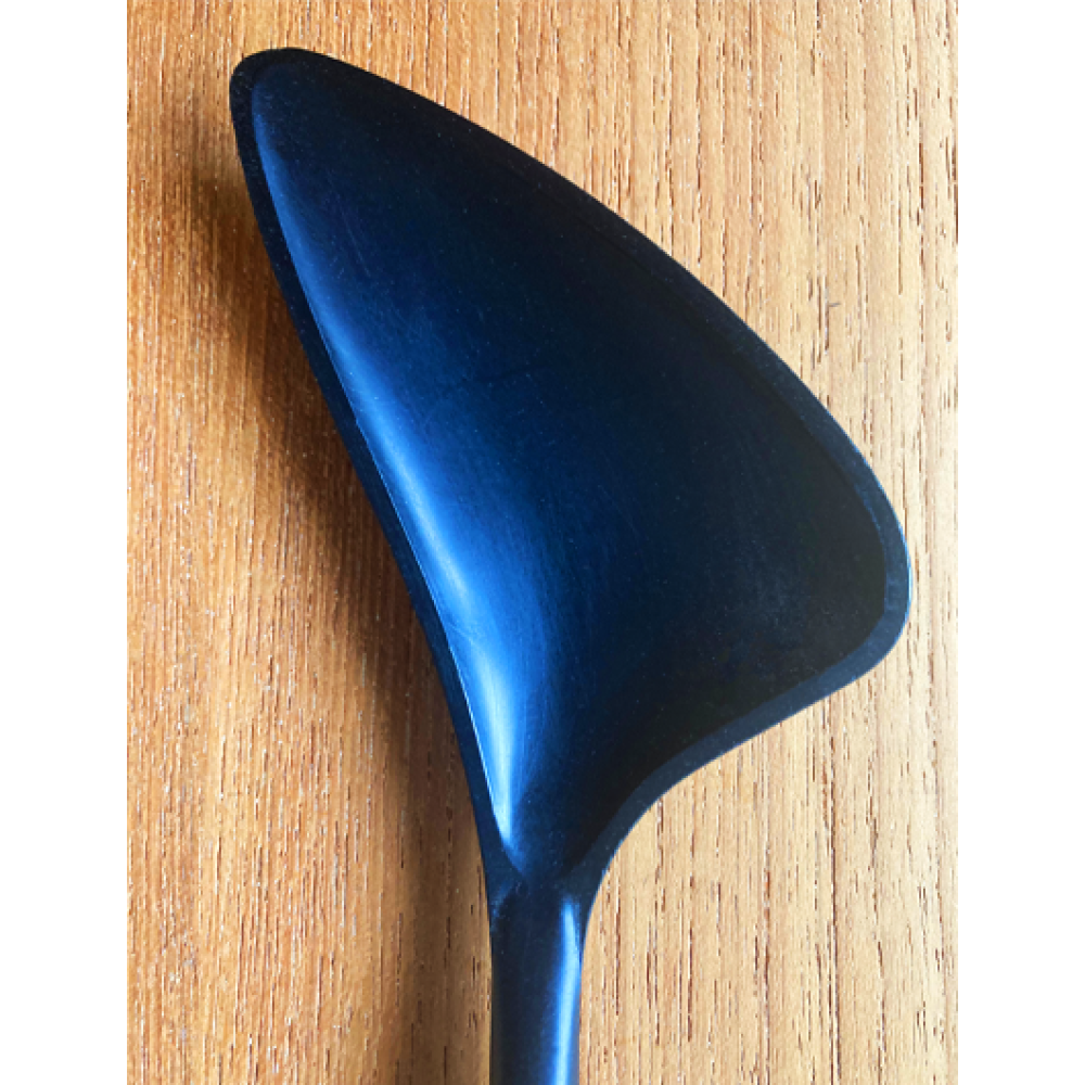 De lepels hebben een roestvrijstalen ring die de matzwarte plastic koppen van overdreven, semi-abstracte vorm.
