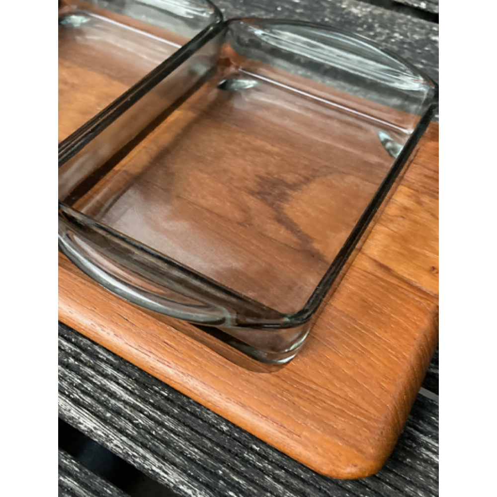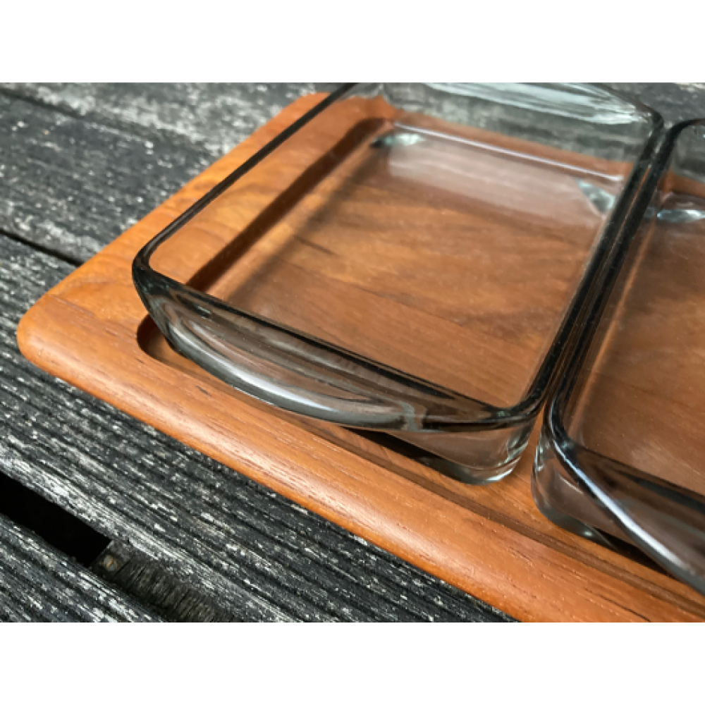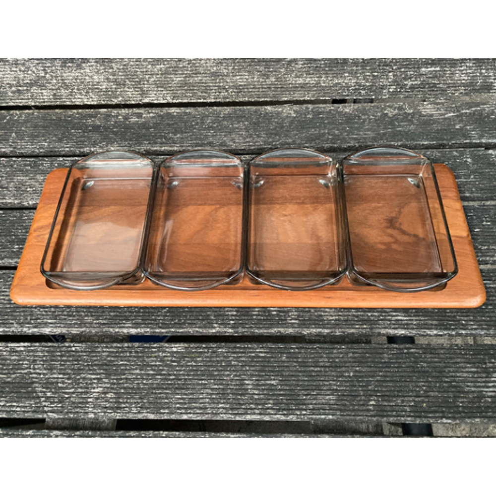 Vier rookglazen schalen van Holmegaard passen perfect op het dienblad.
