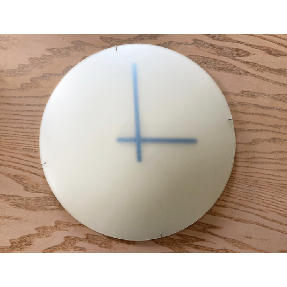 DK wandklok met gezandstraalde bolvormige glazen voorkant en blauwe wijzers.