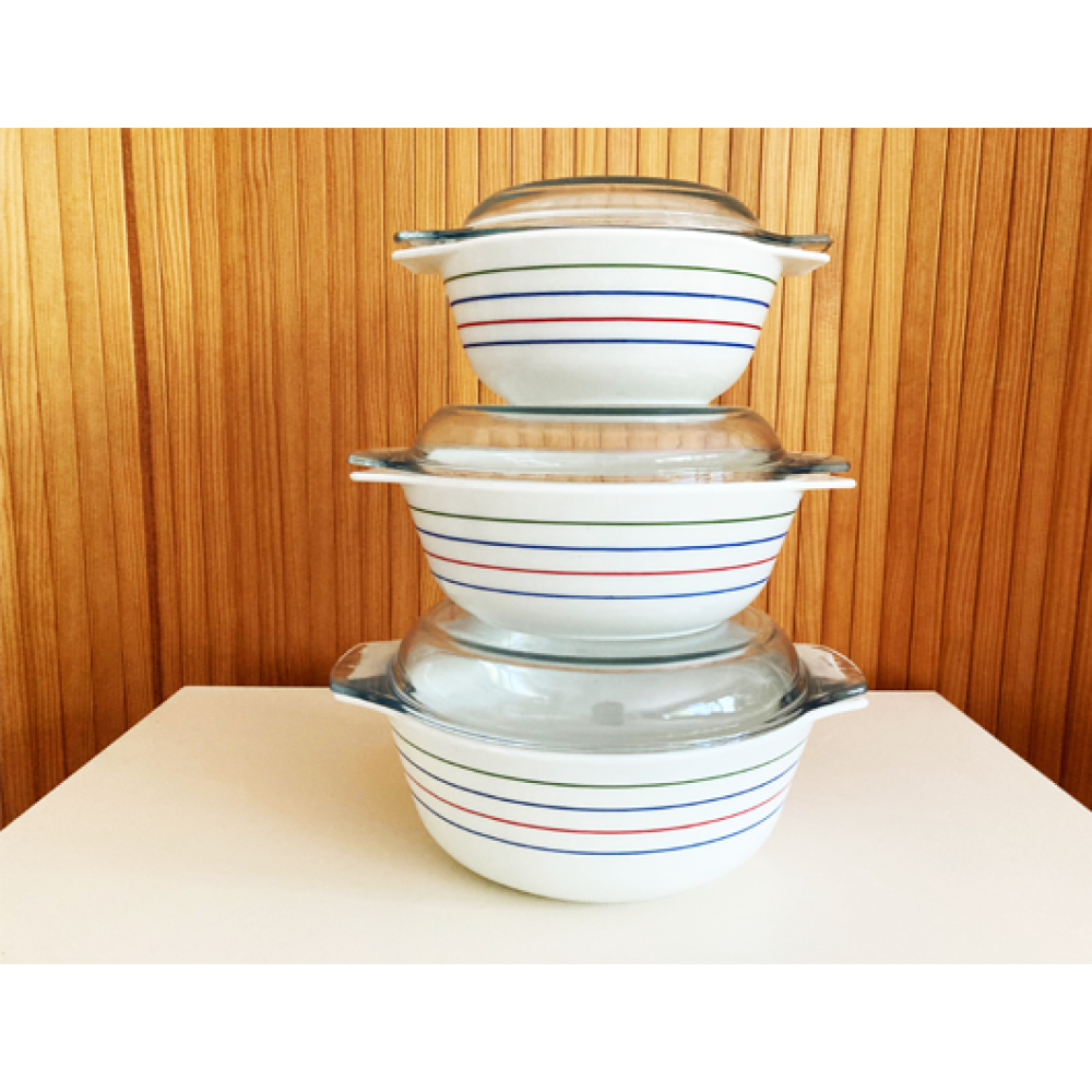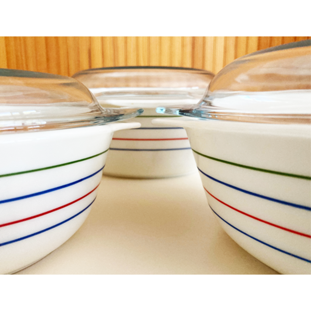 Zeldzame vintage Pyrex glazen ovenschotels in het kleurrijke -Spectrum- patroon.