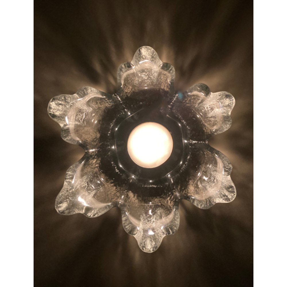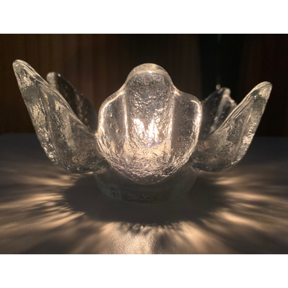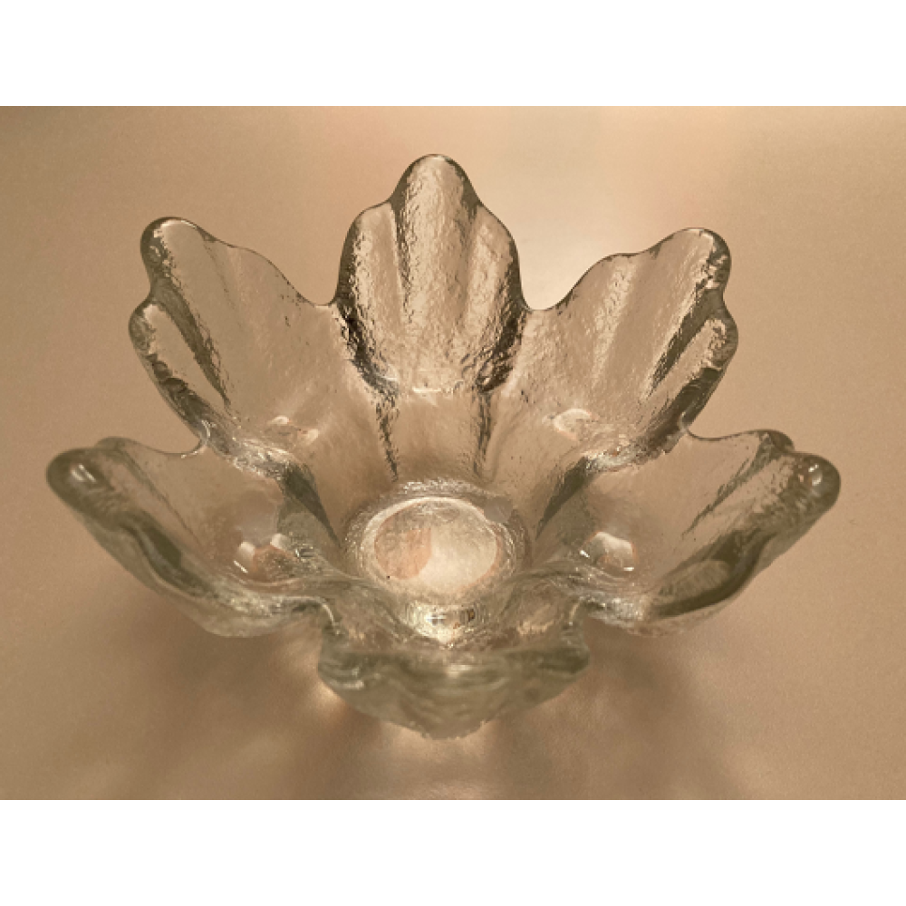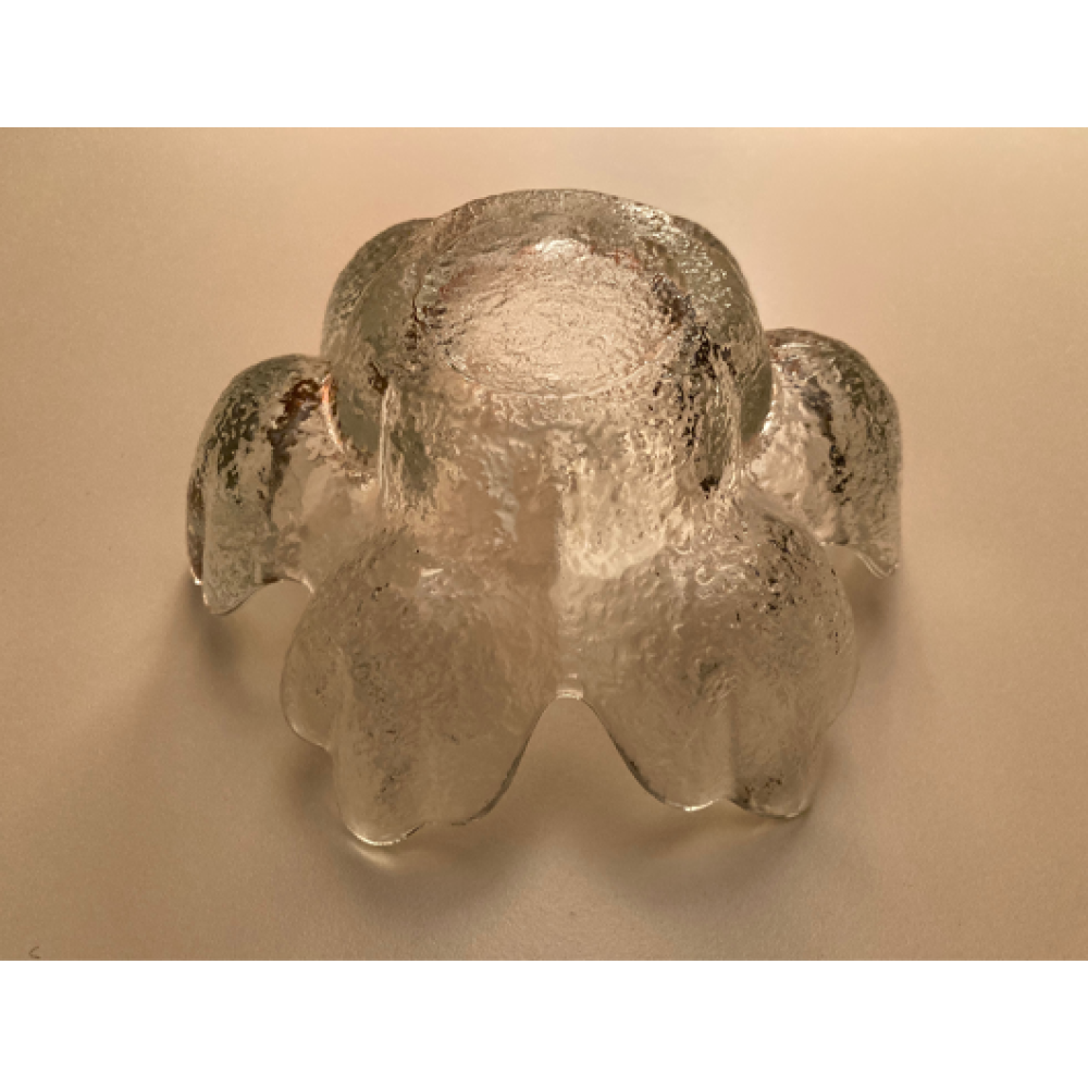 Deze zwaar getextureerde glazen kandelaar dateert uit de jaren 70 en heeft een verzonken deel in het midden voor een kaars of nachtlampje.
