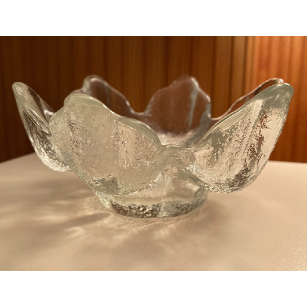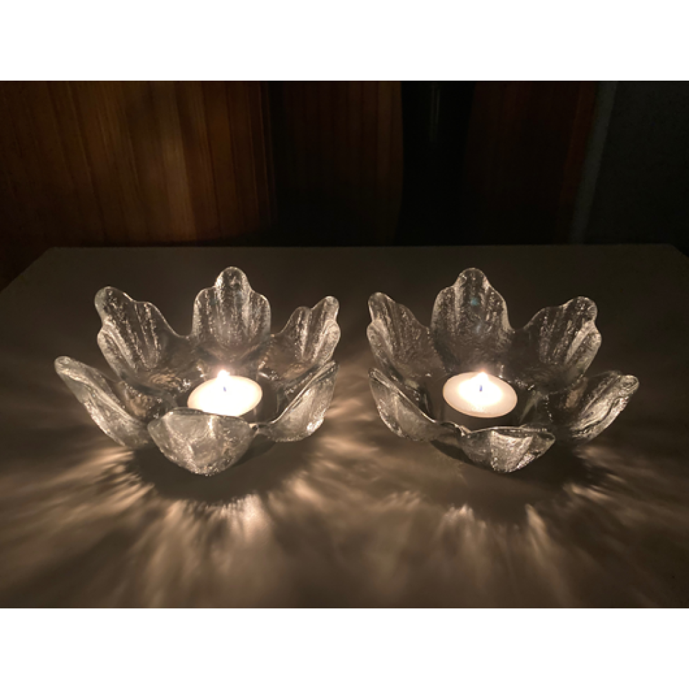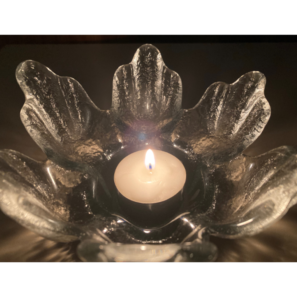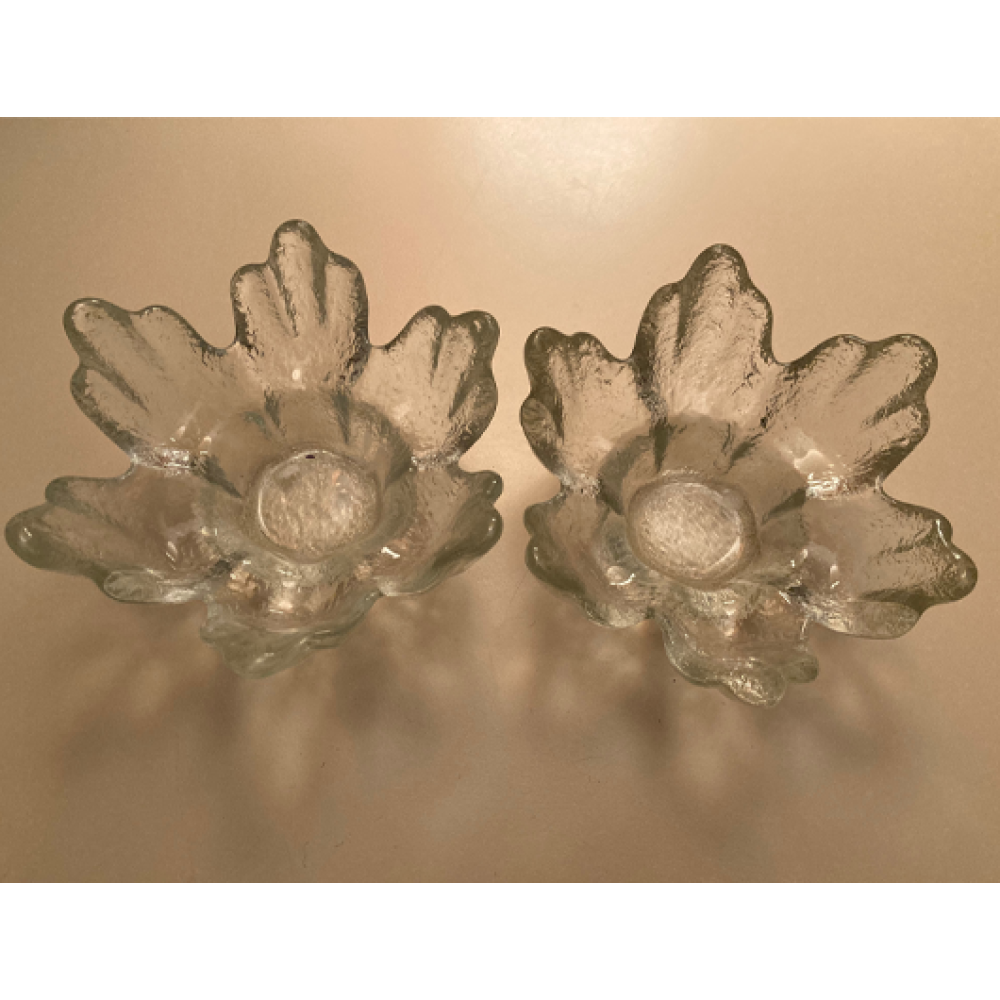 Deze zwaar getextureerde glazen kandelaar dateert uit de jaren 70 en heeft een verzonken deel in het midden voor een kaars of nachtlampje.