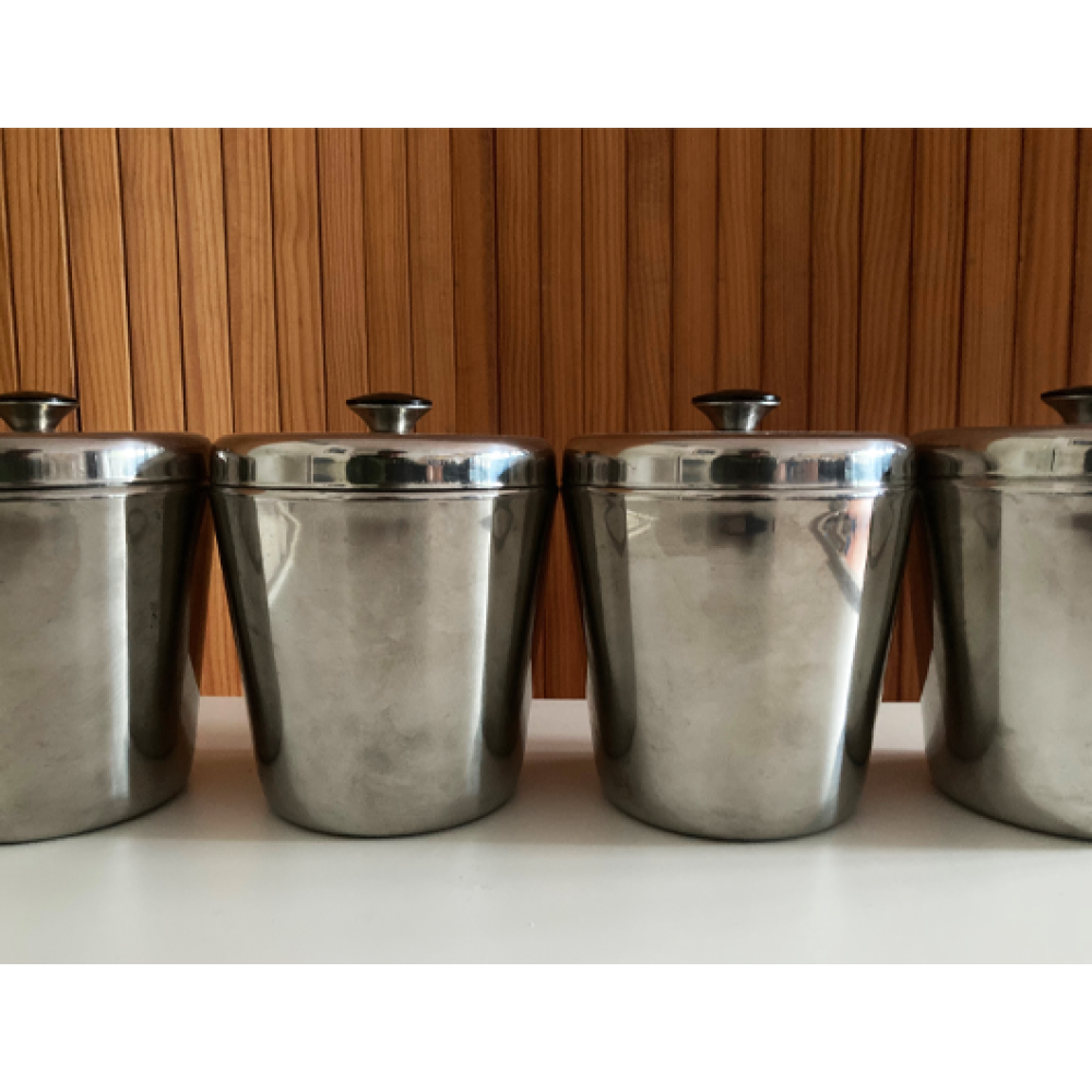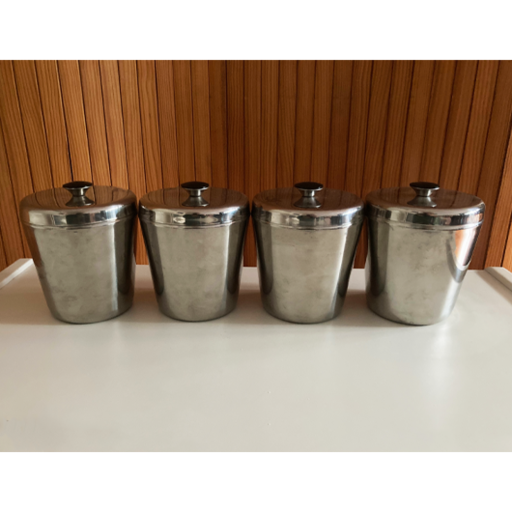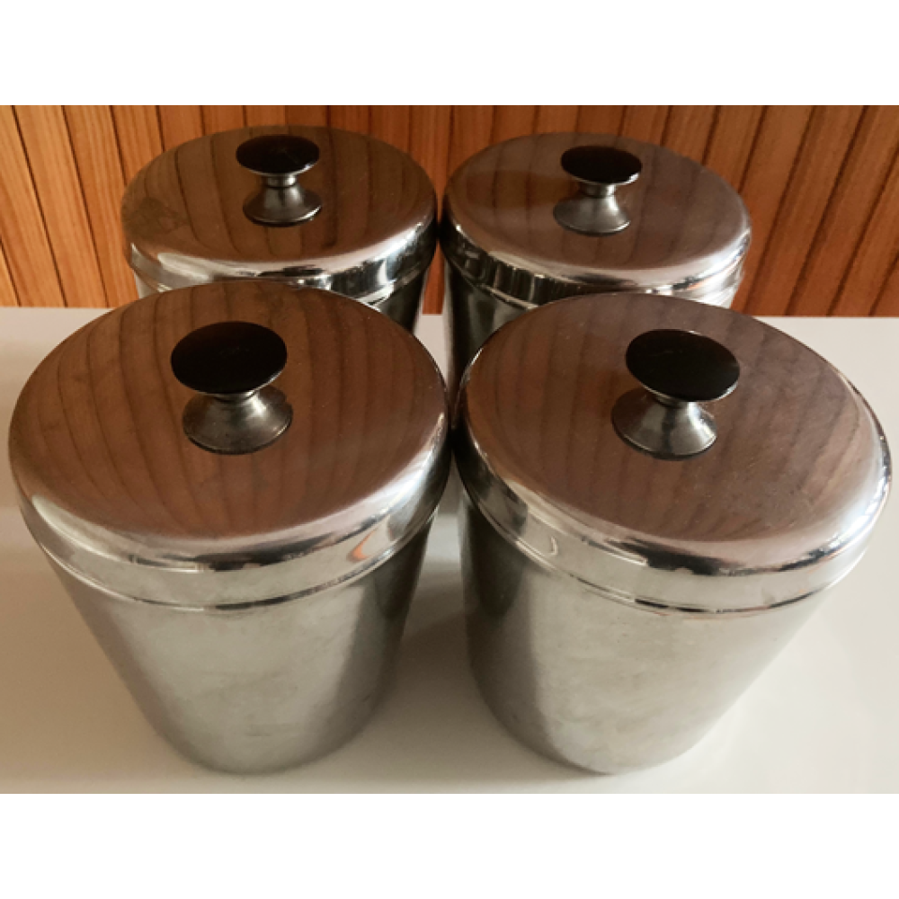 Vier roestvrij stalen voorradbussen met bakeliet handgrepen.