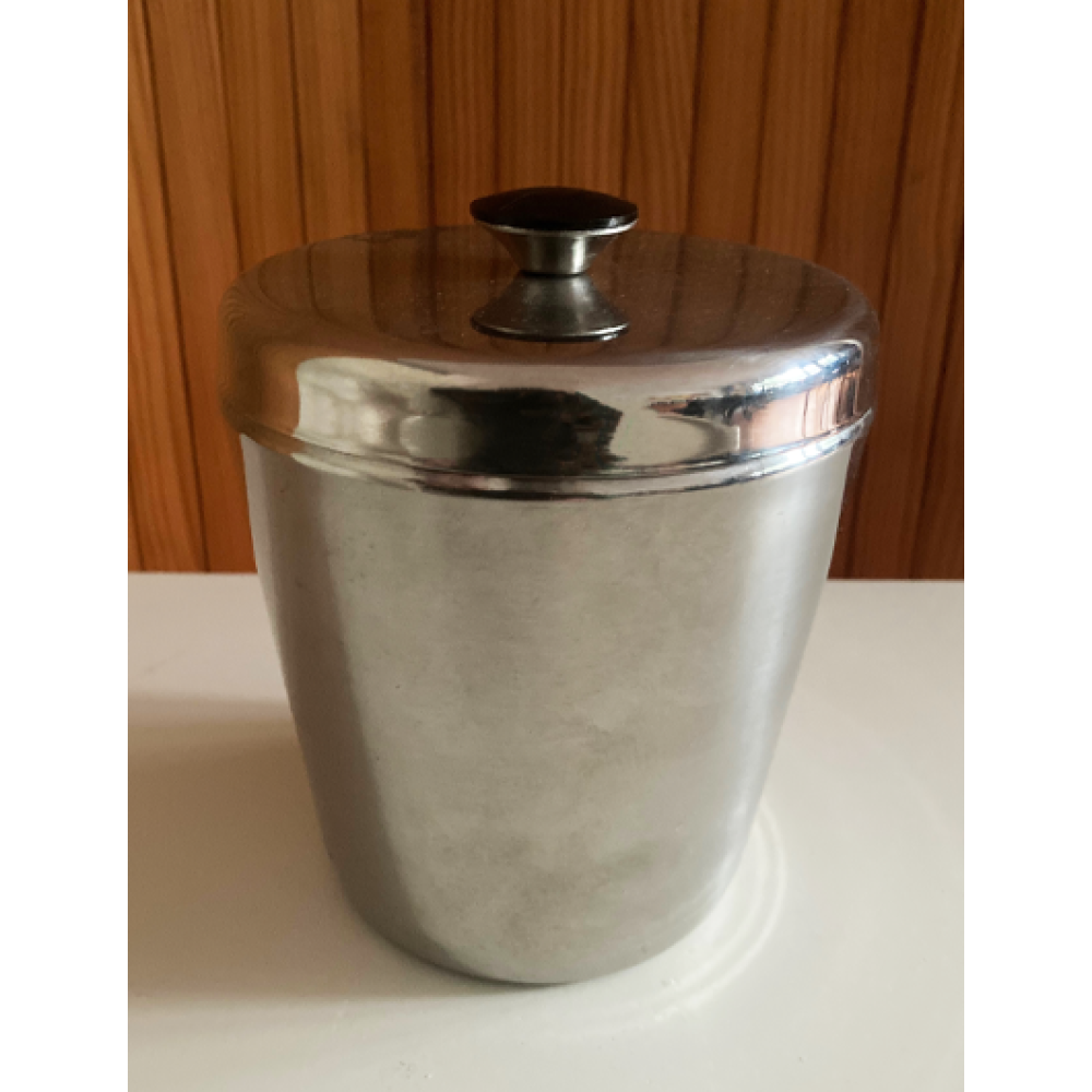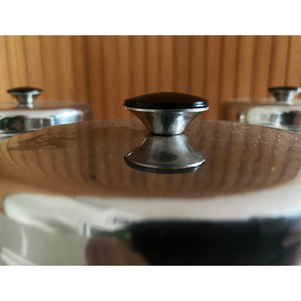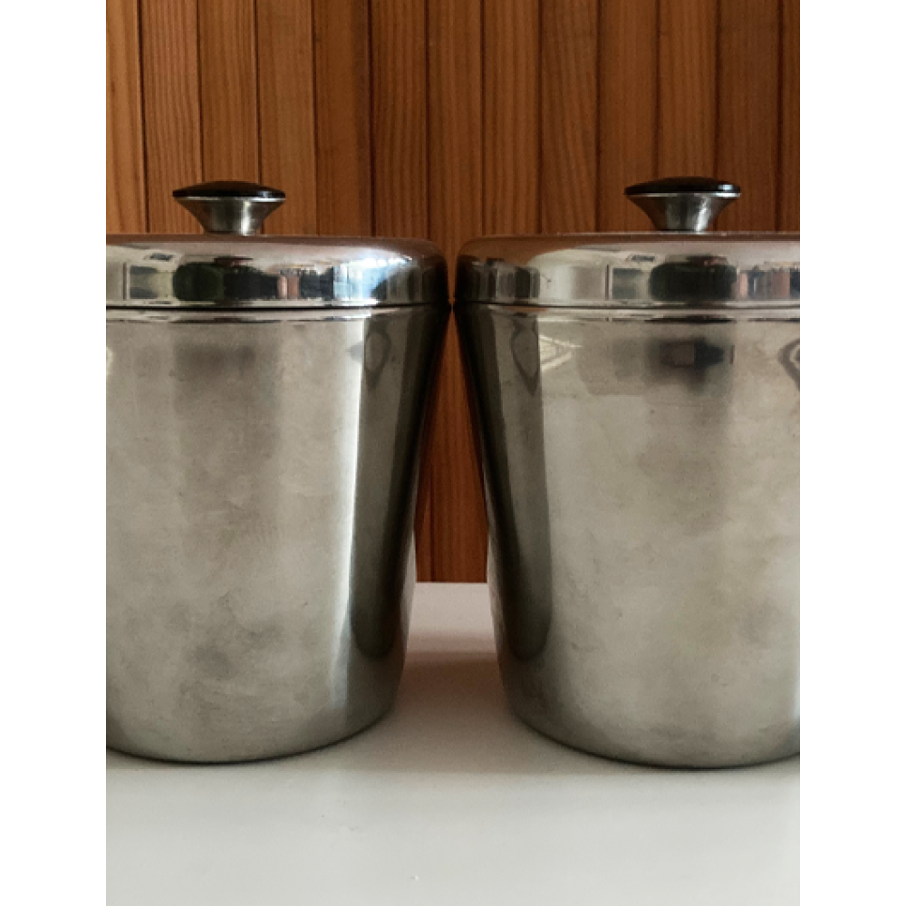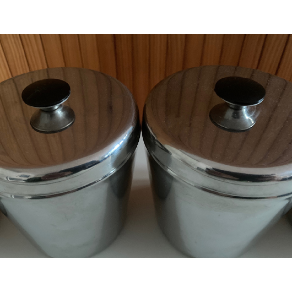 Vier roestvrij stalen voorradbussen met bakeliet handgrepen.