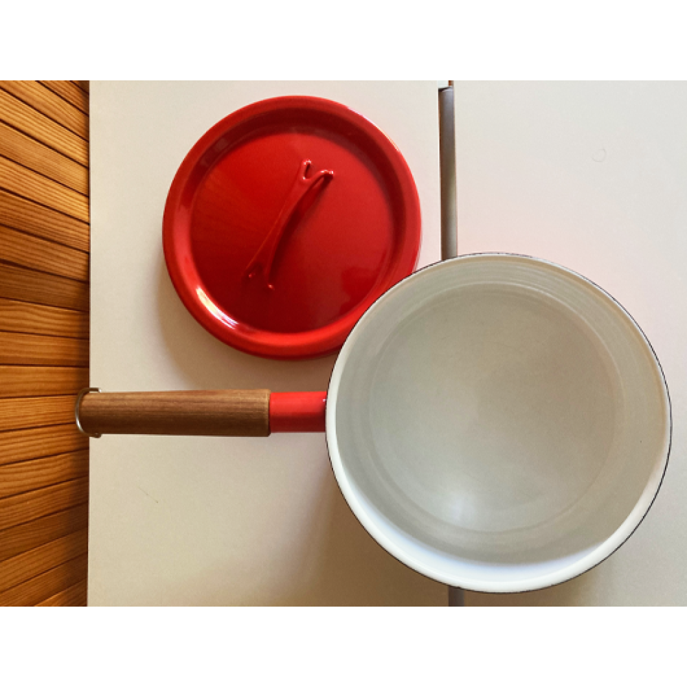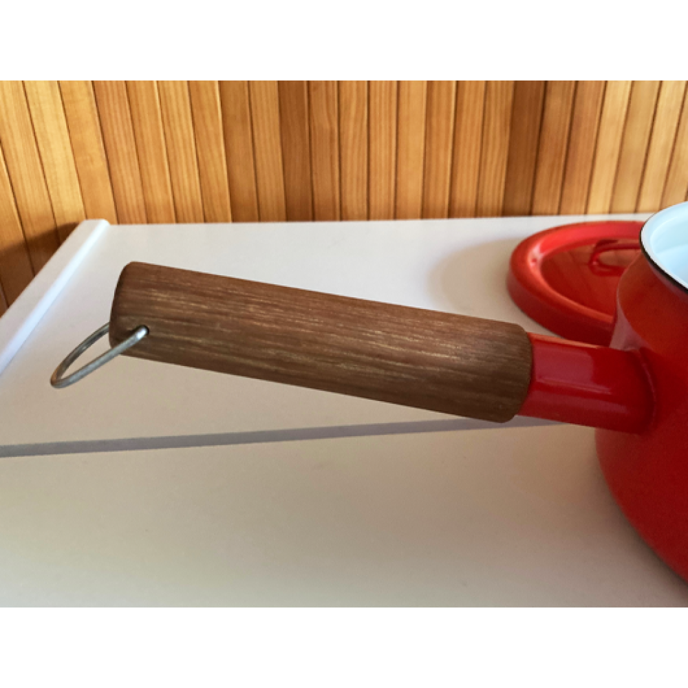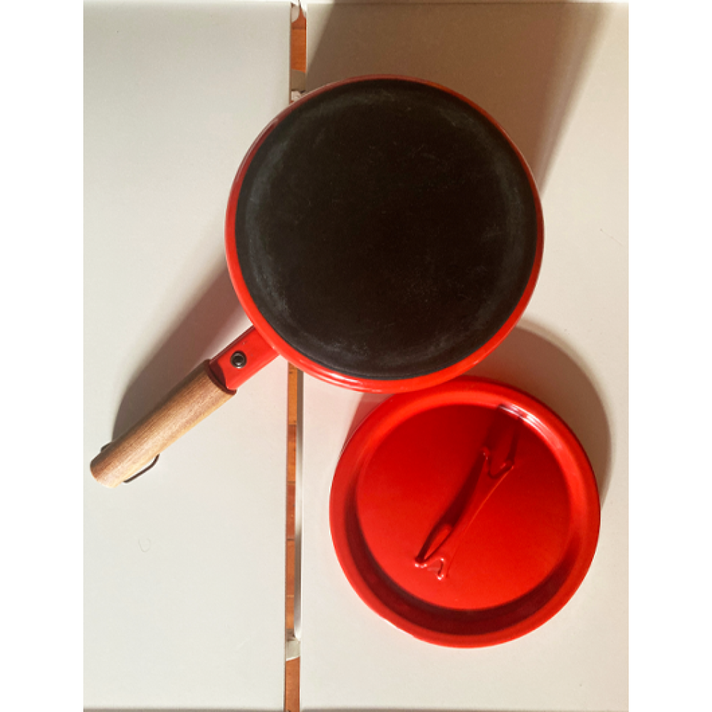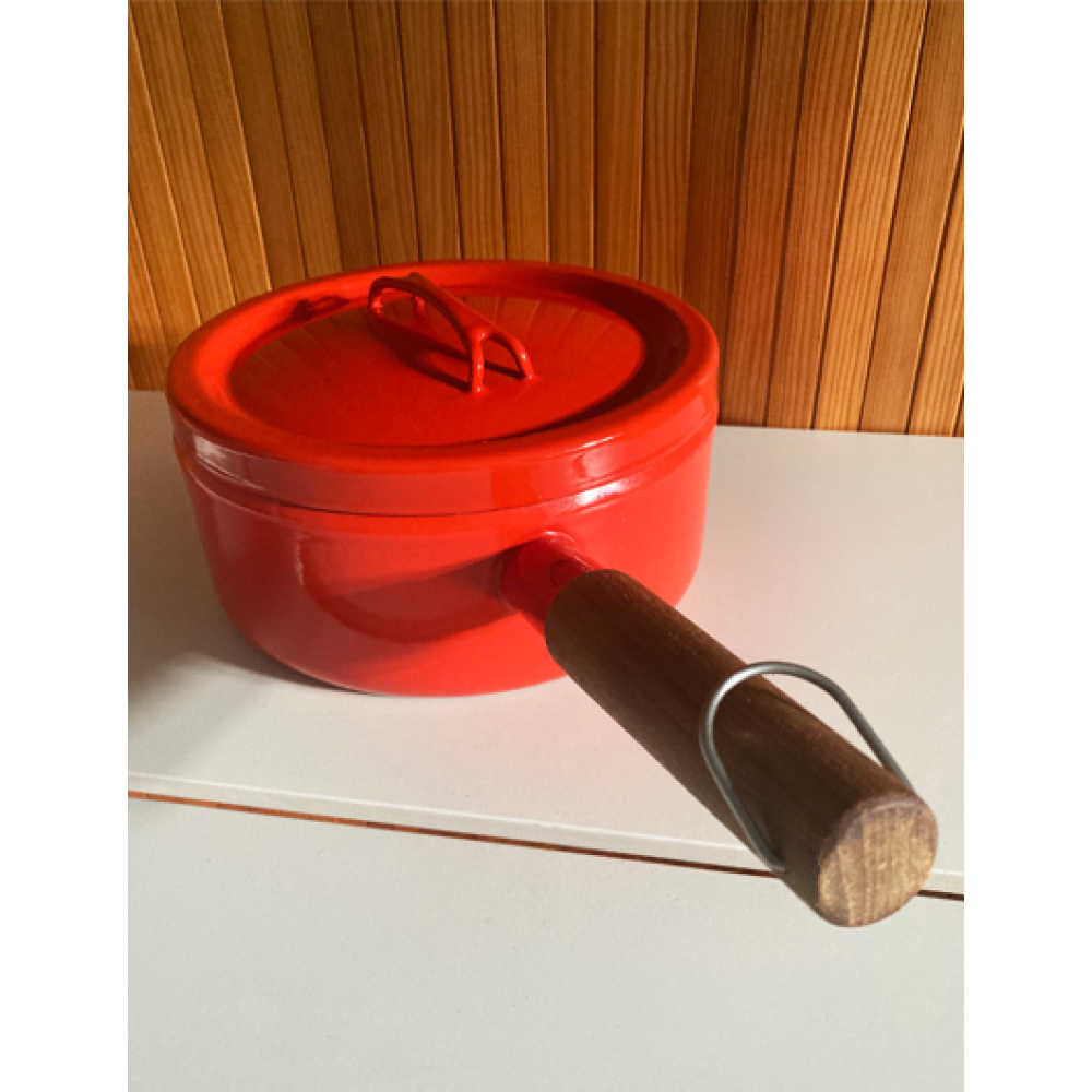 Deze rode emaille steelpan met houten handvat is ontworpen door Seppo Mallat voor Arabia Wärtsilä Finel in de jaren '70.