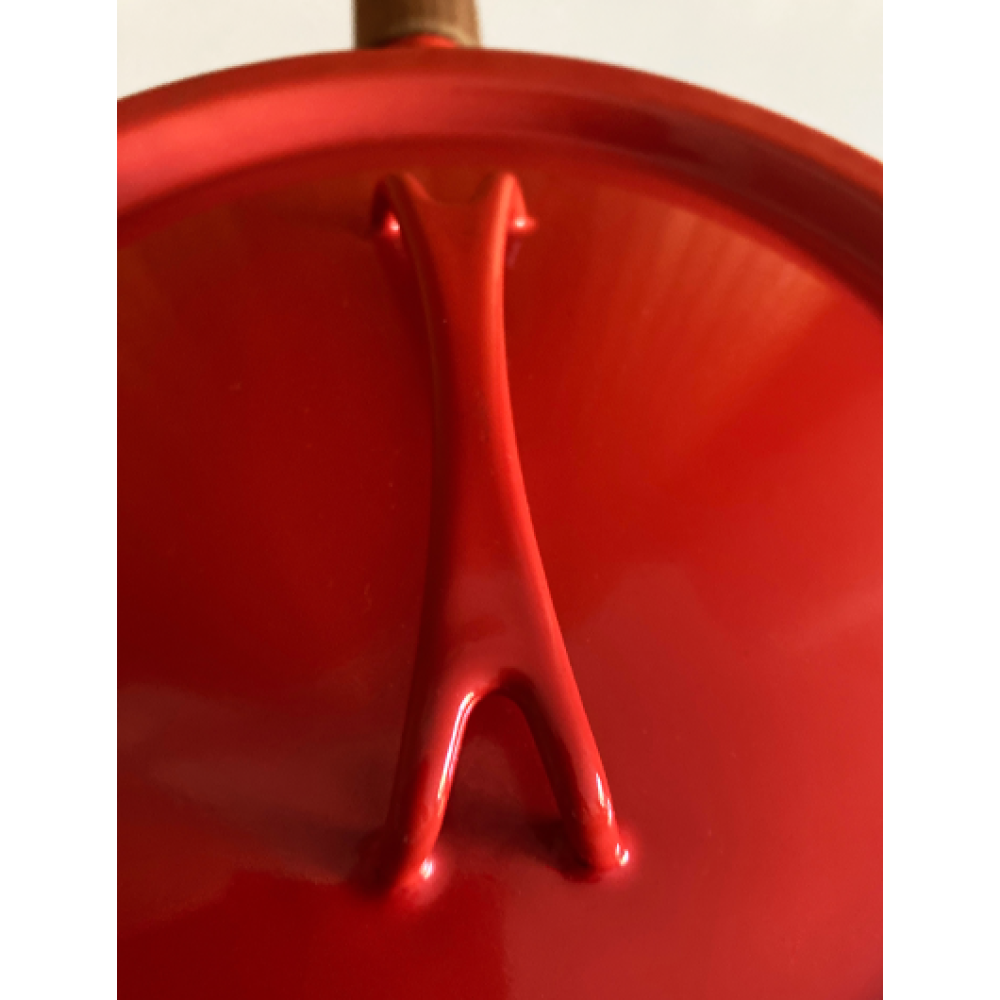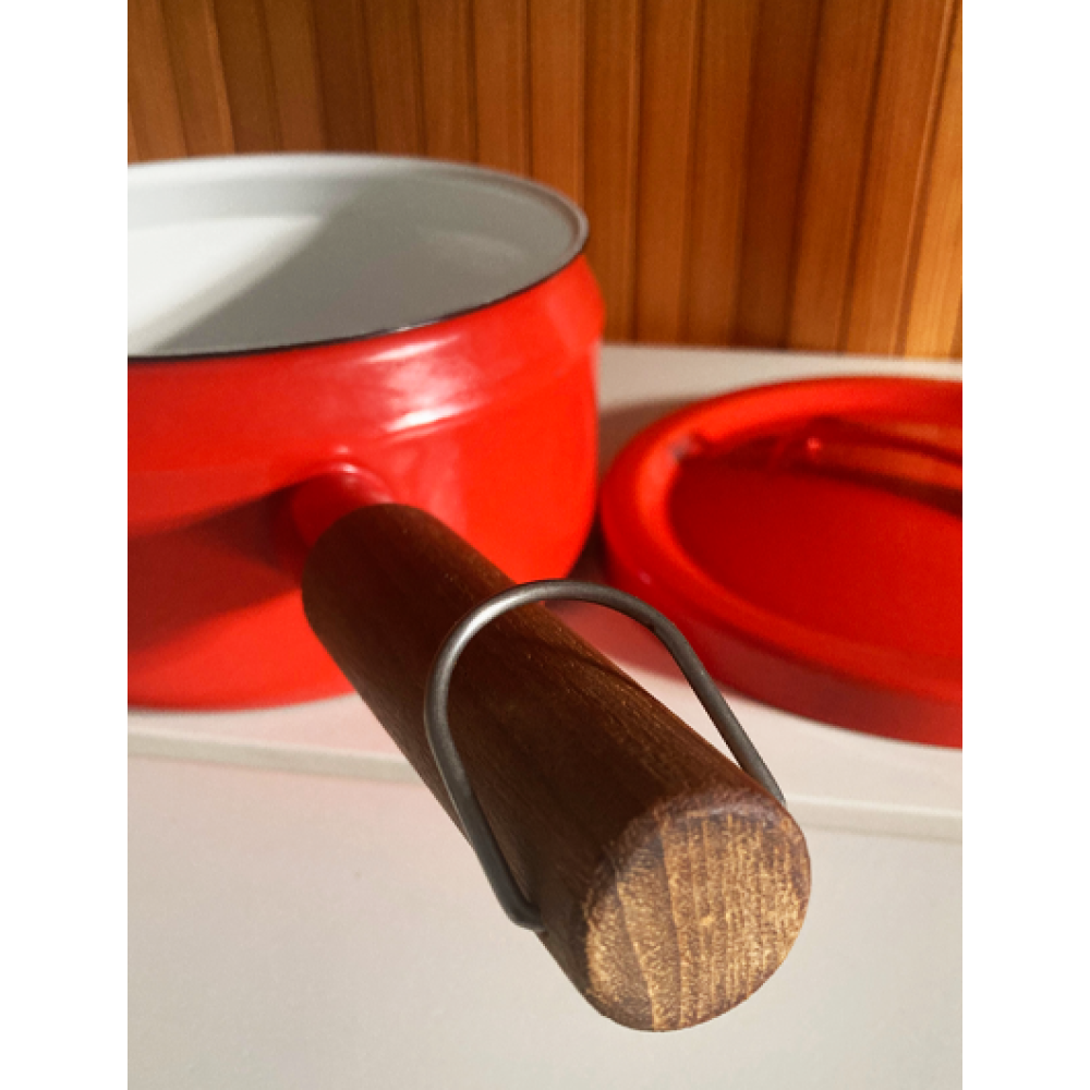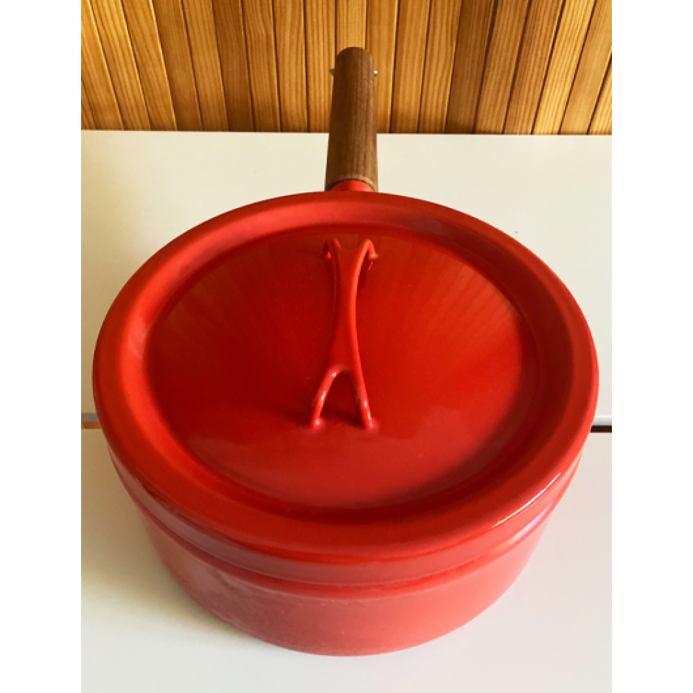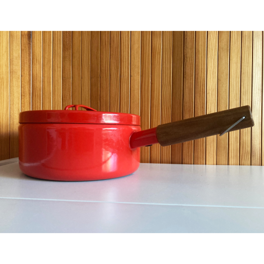 Deze rode emaille steelpan met houten handvat is ontworpen door Seppo Mallat voor Arabia Wärtsilä Finel in de jaren '70.