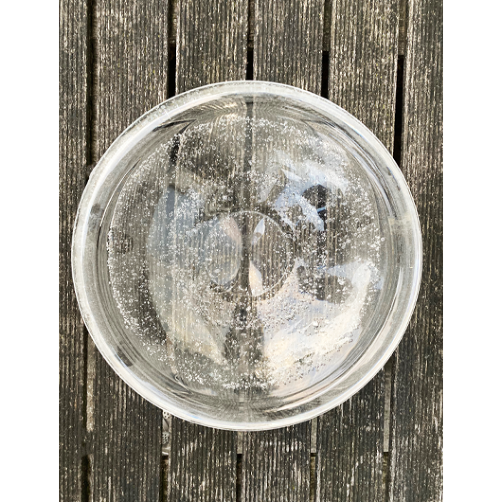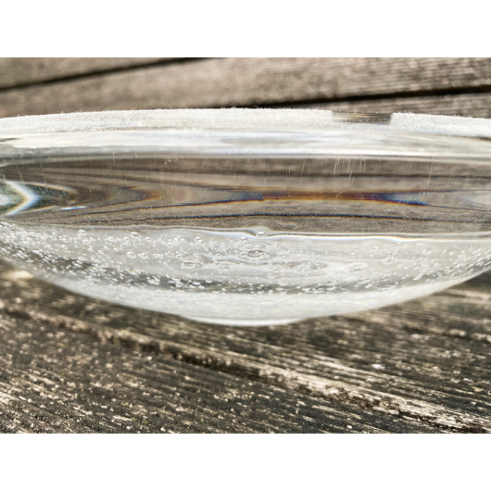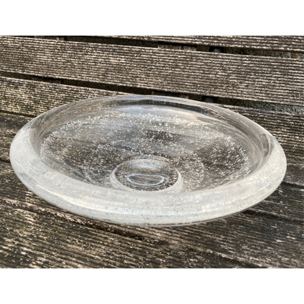 Dikwandige zware kristallen schaal met ingesloten onregelmatige luchtbellen.