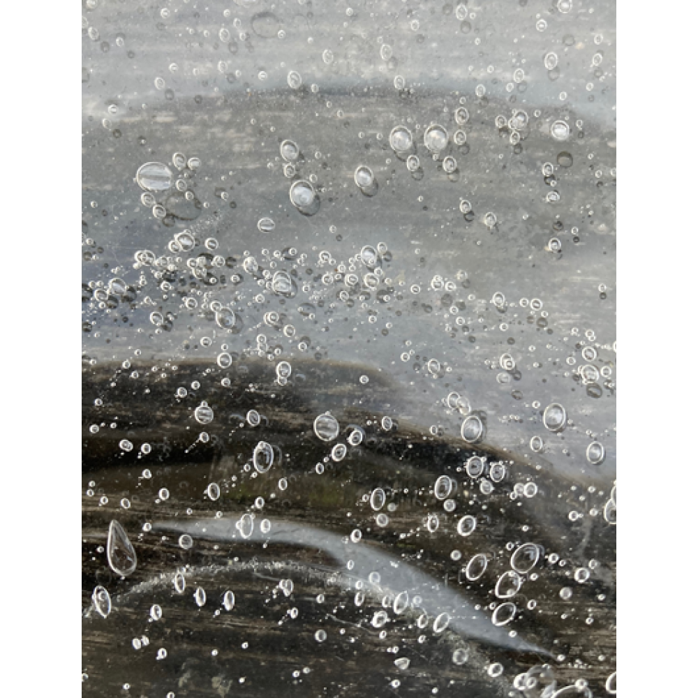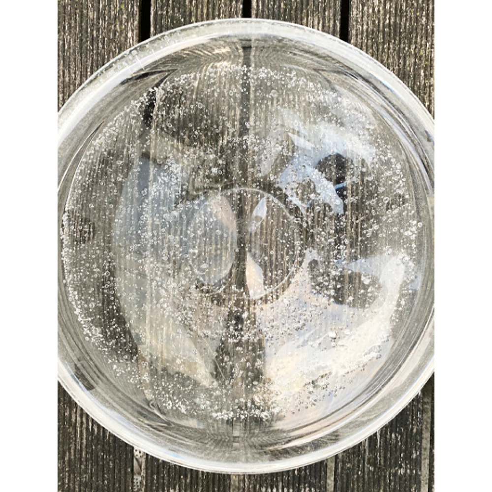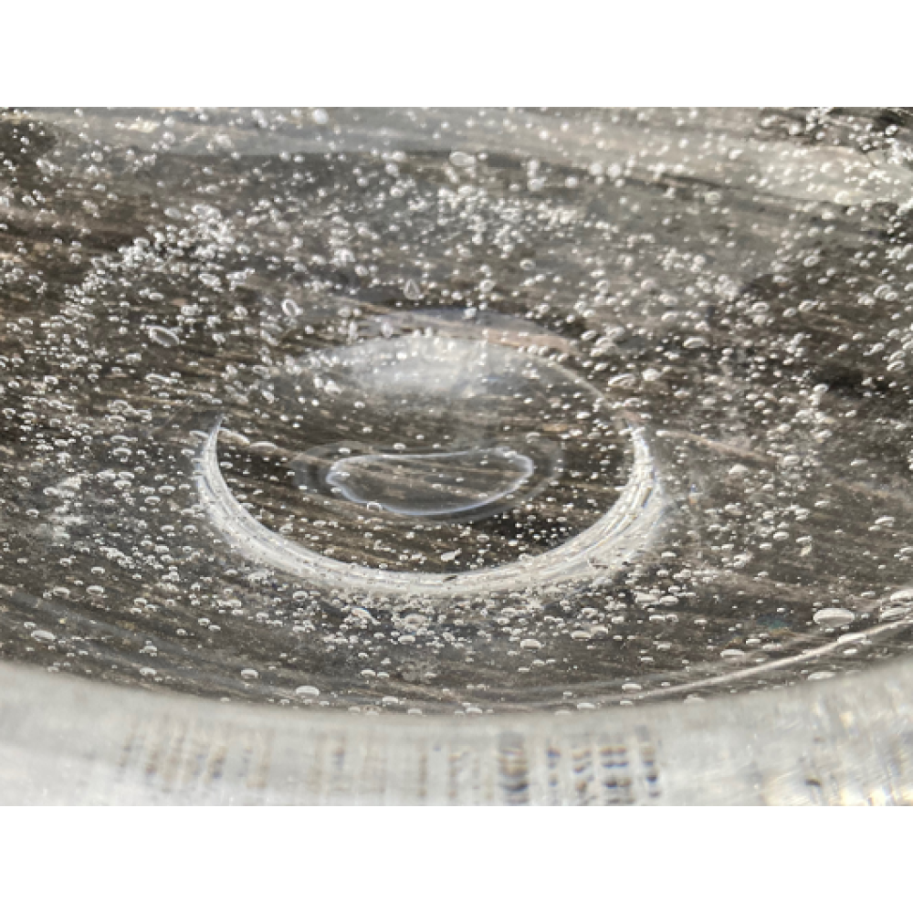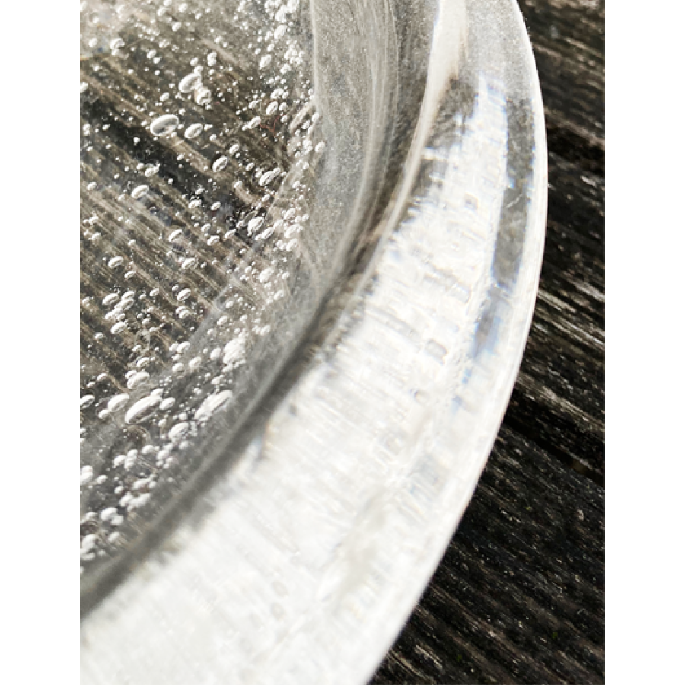 Dikwandige zware kristallen schaal met ingesloten onregelmatige luchtbellen.